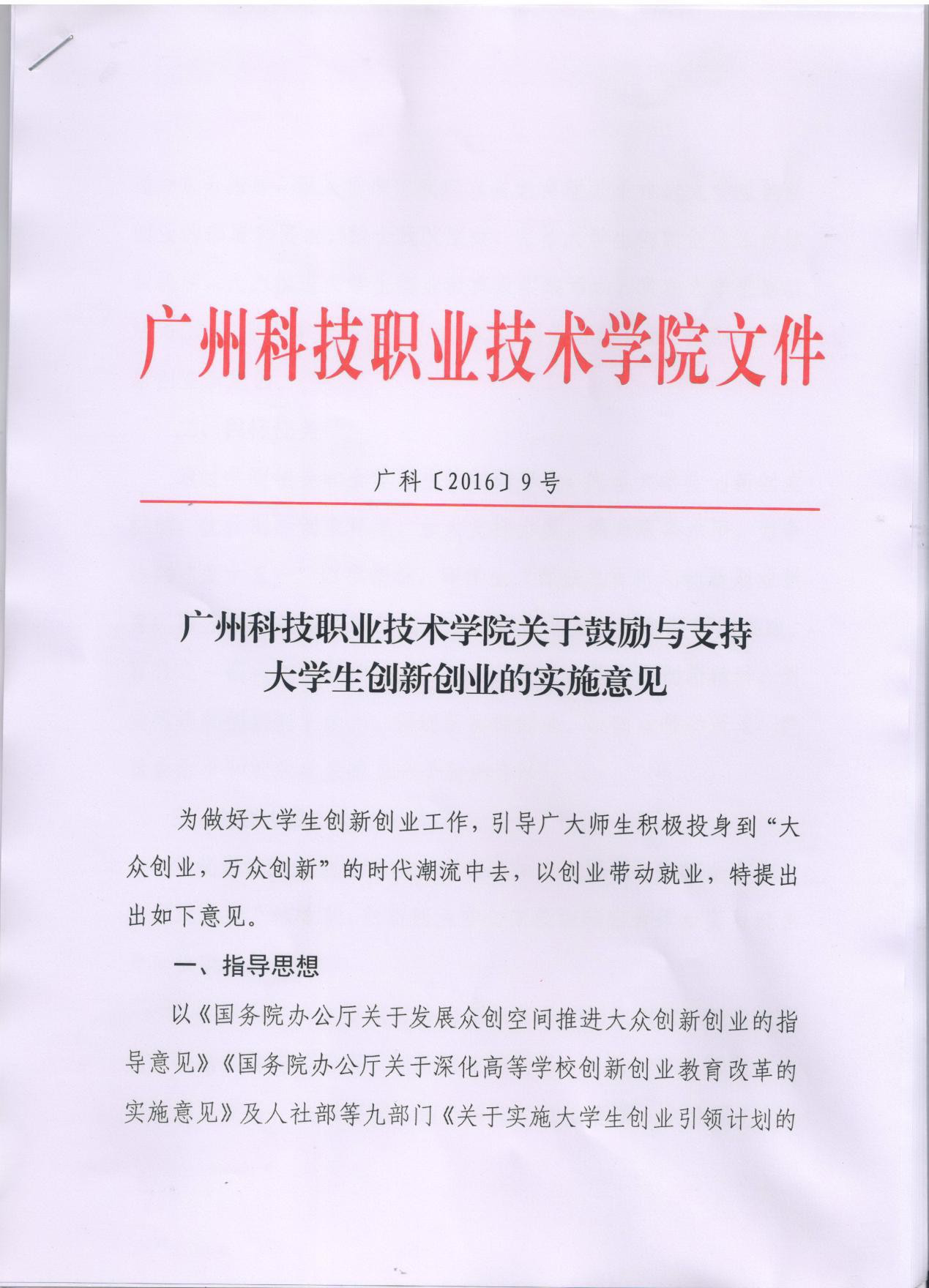 广州科技职业技术学院关于鼓励与支持大学生创新创业的实施意见