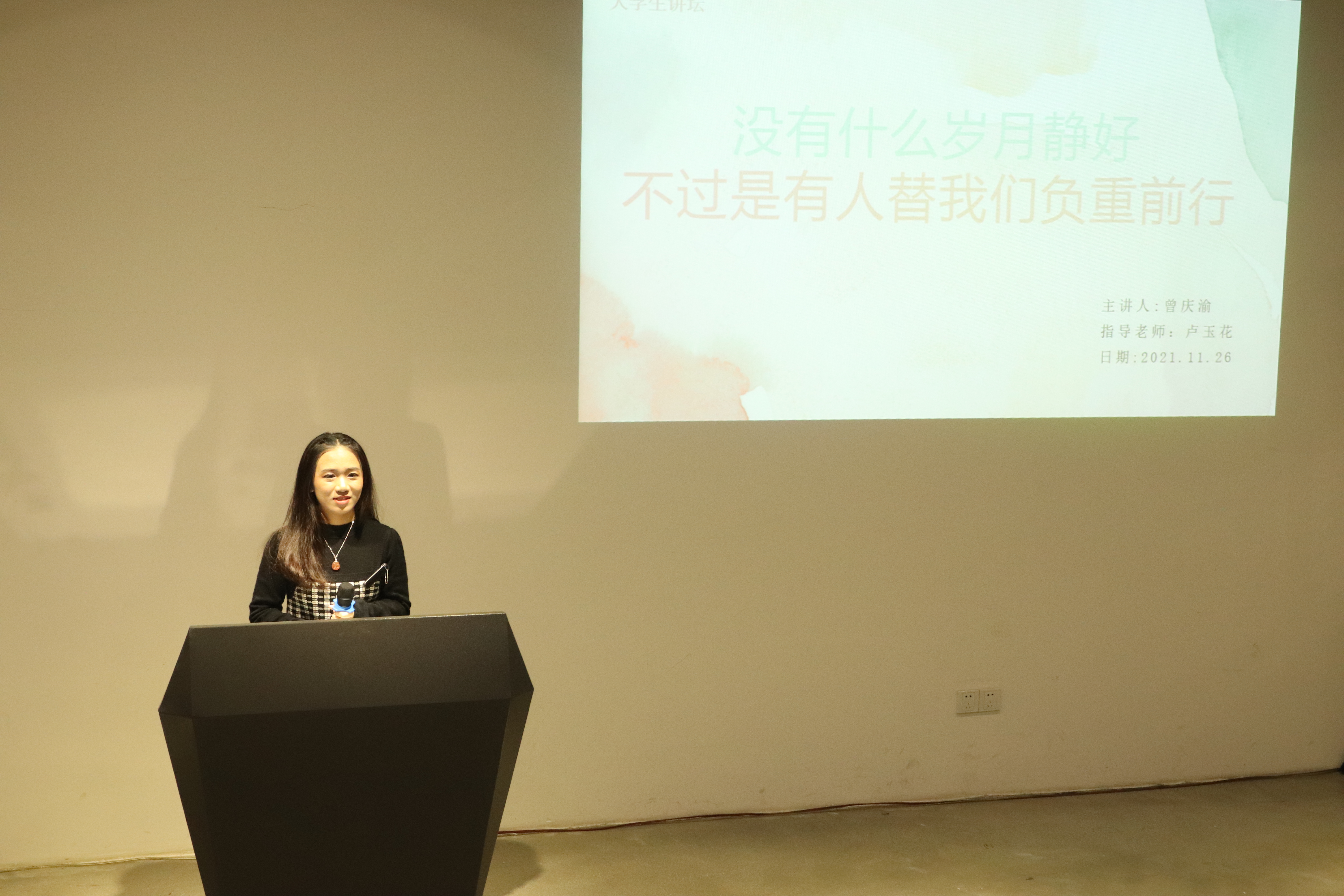 2021年11月26日晚,由188bet金宝搏最新版本更新内容介绍主办的“大学生讲坛”第五讲在图书馆新书发布厅进行。本次的主讲人是来自19土木工程2班的曾庆渝同学,现任建筑工程学院团总支副书记,班级副班及团支书;其演讲的主题是“没有什么岁月静好,不过是有人替我们负重前行。”此次讲坛由校团委广播站的何子盈同学主持。
