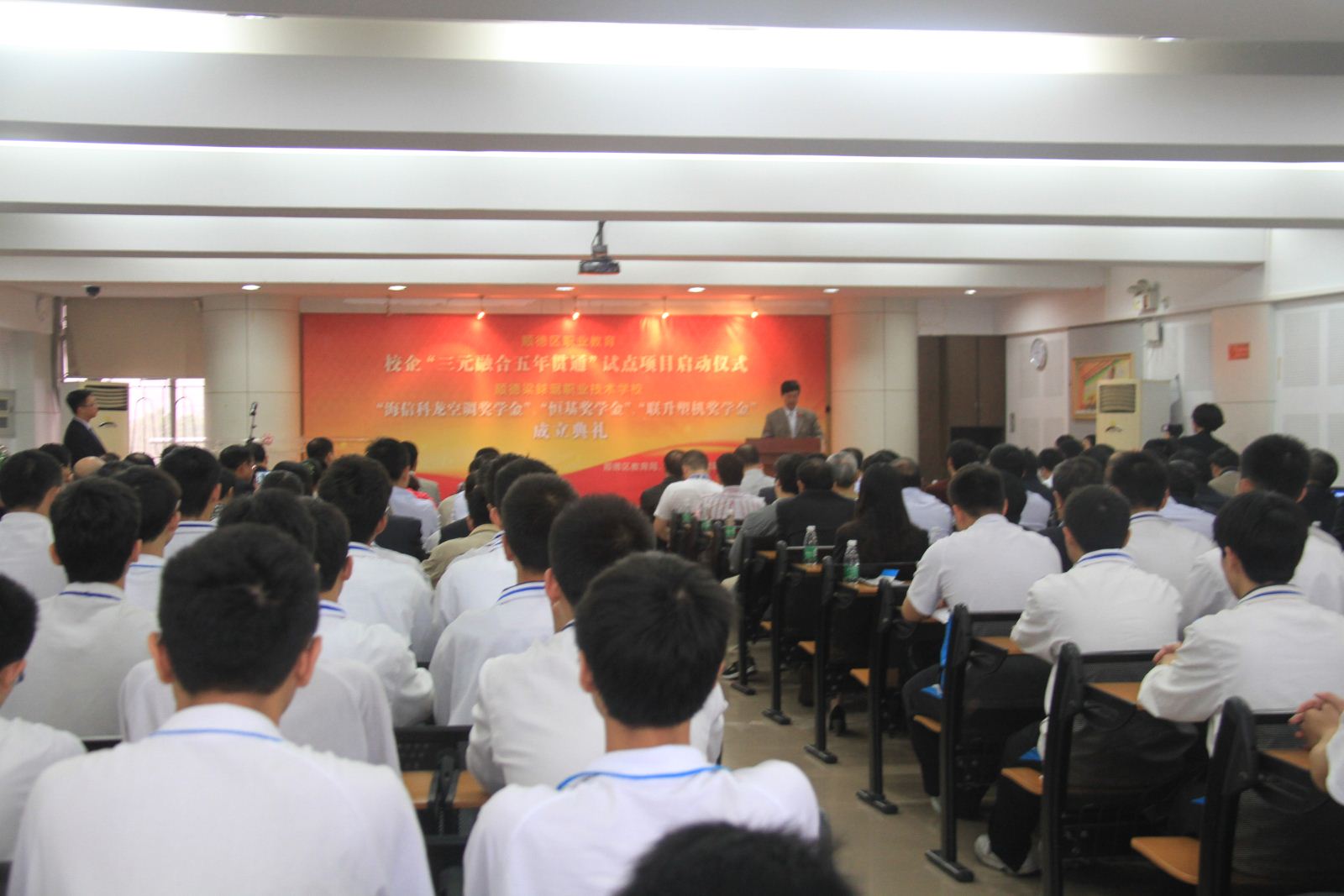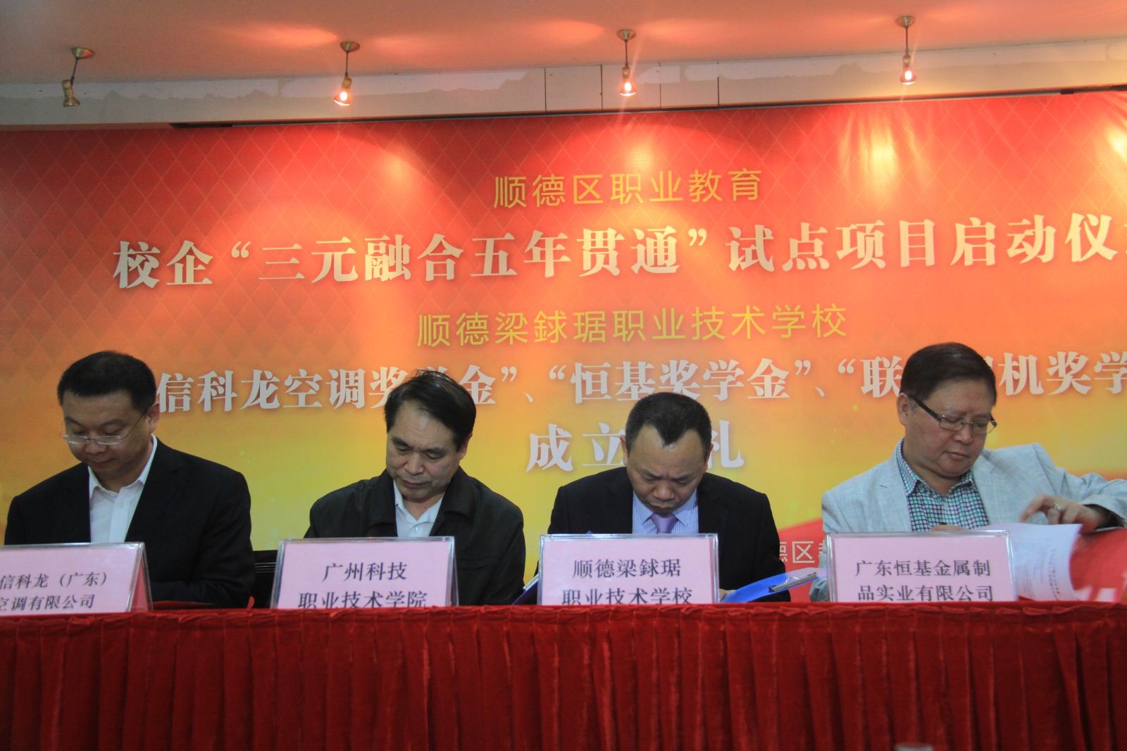 (广科新闻网)5月7日,我院在顺德梁銶琚职业技术学校会议厅,与梁銶琚职业技术学校,以及海信科龙、恒基金属等企业签订启动全省首个校企“三元融合五年贯通”试点项目。学院崔英德院长、李莹副院长、主管教学副院长以及机械工程系等各系部主任近30人,佛山市教育局副局长赵银生,顺德区教育局局长徐国元,顺德梁銶琚职业技术学校黄瑞兴校长、韩亚兰副校长等教职员工和来自海信科龙、恒基金属等企业代表以及佛山电视台,佛山日报、珠江商报恒基金属等记者近200多人,见证了这一启动仪式。
