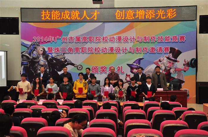 2014年11月22日,由广州市教育局主办、广州科技贸易职业学院承办的2014年广州市属高职院校动漫设计与制作技能竞赛暨珠三角地区动漫设计与制作技能邀请赛在广州科技贸易职业学院进行。来自14所珠三角地区高职院校近300名选手参加了本次竞赛。由我院电子信息系动漫教研室黄海龙老师为指导老师,带领了动漫设计与制作专业的三名学生参加了此次比赛,并取得喜人的成绩,其中梁伟森、姚保伟两名学生的作品分别获得了二等奖和三等奖。