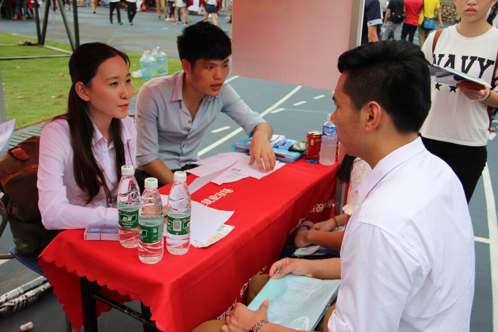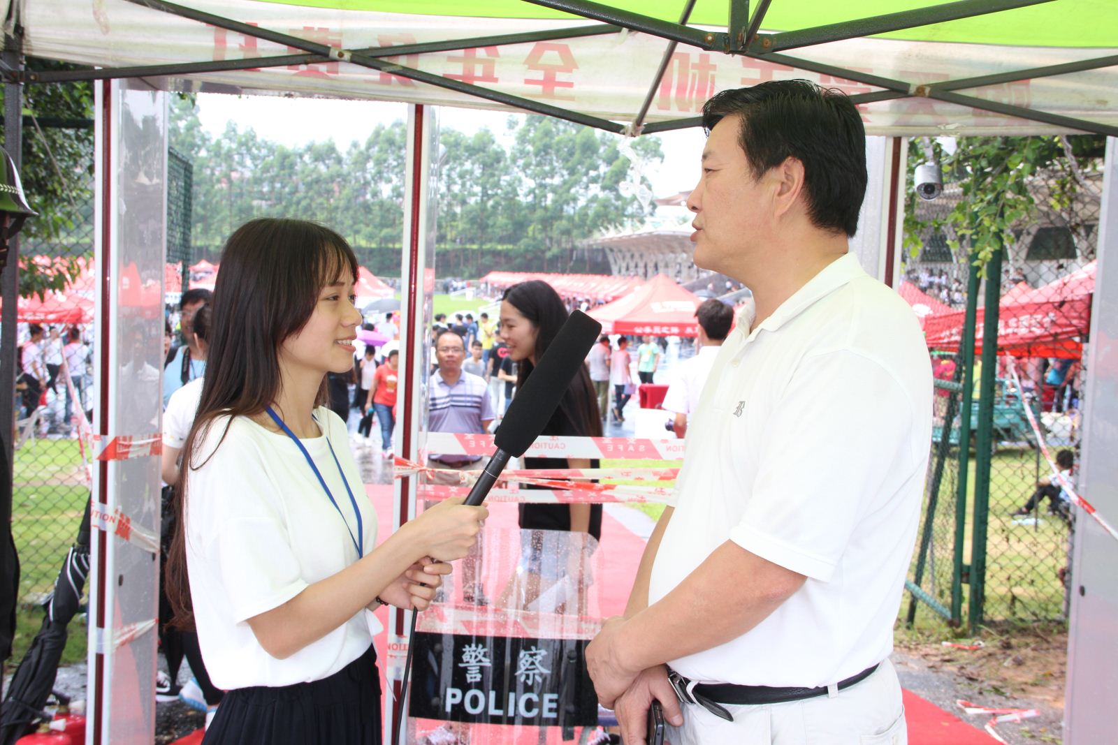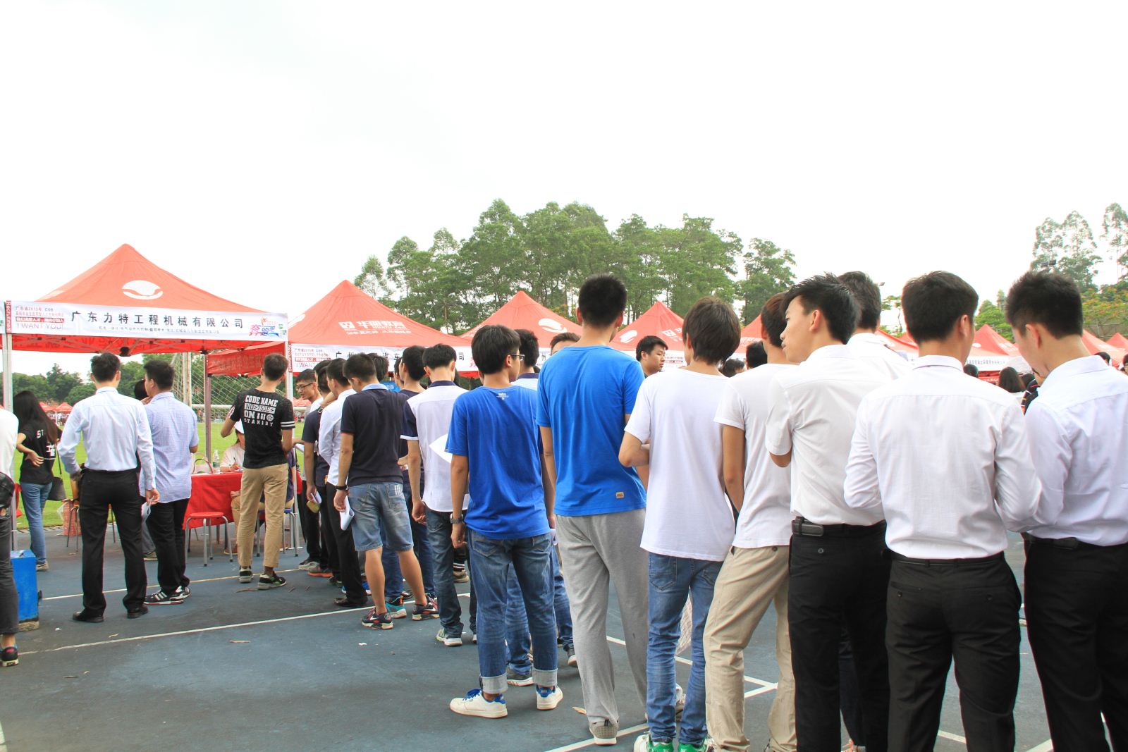 招聘会入口设置安检门,每位入场者凭简历和入场券进入会场。招聘会现场秩序井然,为了保障每位入场求职人员的安全,学院保卫处联合钟落潭派出所在会场巡逻,保持会场及会场周边交通安全顺畅,学院团委也组织了大量学生志愿者为招聘会现场的企业和应聘者服务。每家招聘企业的帐篷前都排起了长龙。应聘者把自己的简历递给自己心仪的企业,企业也向应聘者们介绍自己的企业,跟应聘者面对面的沟通。