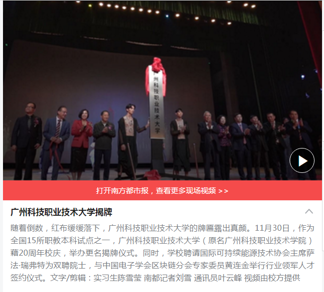 随着倒数,红布缓缓落下,188bet金宝搏最新版本更新内容介绍的牌匾露出真颜。11月30日,作为全国15所职教本科试点之一,188bet金宝搏最新版本更新内容介绍(原名广州科技职业技术学院)藉20周年校庆,举办更名揭牌仪式。同时,学校聘请国际可持续能源技术协会主席萨法·瑞弗特为双聘院士,与中国电子学会区块链分会专家委员黄连金举行行业领军人才签约仪式